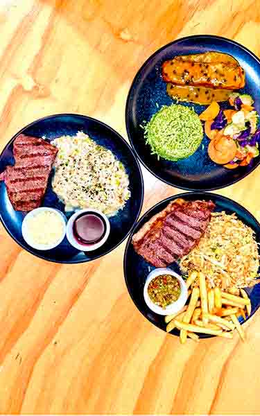 O Pueblito, com inspiração uruguaia, propõe entradas como salada verde ou pães de alho antes de pratos como baby beef ao alho com arroz parrilleiro e legumes grelhados, meio galeto marinado com arroz de brócolis e purê cremoso, ou costela suína ao barbecue com feijão tropeiro e fritas. As sobremesas incluem banana na brasa com doce de leite e sorvete ou panqueca de doce de leite com sorvete.