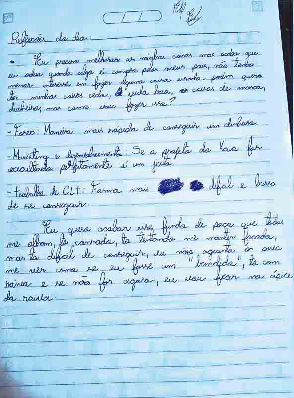 O caderno também trazia um panorama de sua vida financeira, com entradas e saídas de dinheiro, valores destinados a investimentos, como em operações de Forex, e quantias reservadas para lazer e cuidados pessoais. Mesmo com uma aparente tentativa de organização e planejamento, o jovem deixava transparecer um estado emocional abalado. Relatava medo, raiva e solidão, e dizia estar vivendo uma “tragédia”. A distância da família e a falta de apoio também eram temas recorrentes em seus desabafos. “As pessoas me veem como bandido, perdi meus amigos e minha família tá distante de mim”, escreveu em uma das páginas.