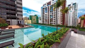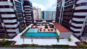 Os apartamentos têm ambientes divididos entre quarto, sala e copa, em uma configuração pensada para atender diferentes perfis de estada. A estrutura também inclui lounge na cobertura, academia, piscina e sauna.