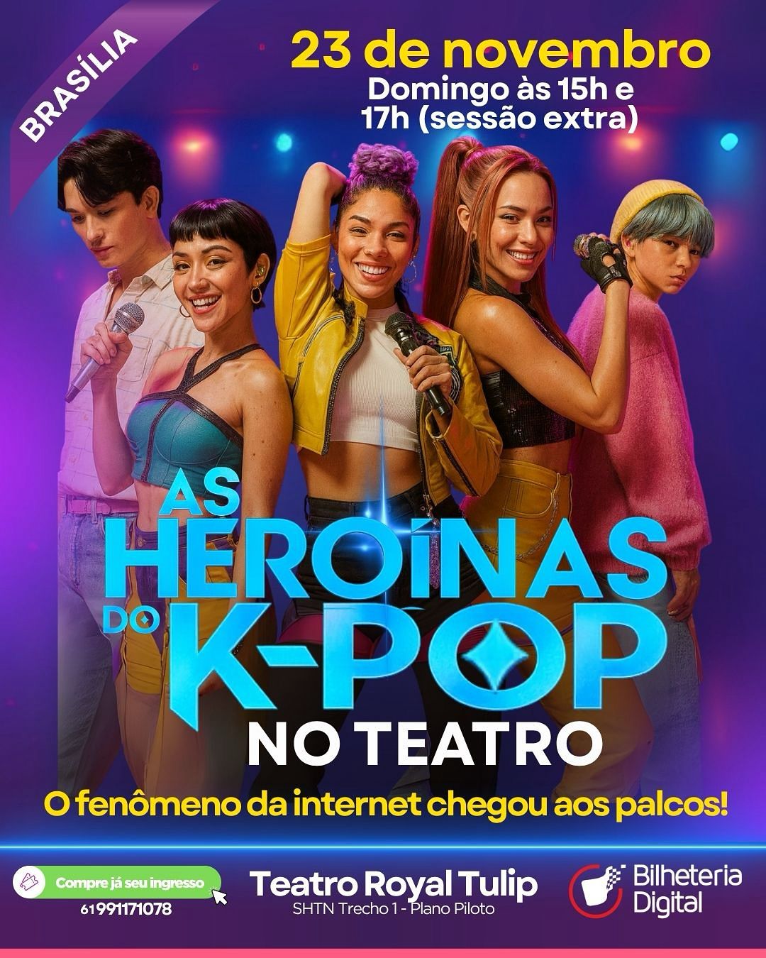 O sucesso foi tão grande que não coube em uma única sessão! O espetáculo Heroínas do K-Pop, que chega a Brasília no dia 23 de novembro, acaba de ganhar uma sessão extra às 17h, no Teatro Royal Tulip. A montagem infantojuvenil, que une música, dança e fantasia, conquistou o público da capital antes mesmo da estreia e a sessão das 15h já está quase esgotada.